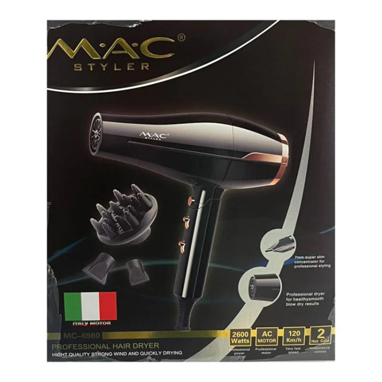 سشوار حرفه ای مک استایلر مدل MC-6950 از نوع سشوارهای فشار سنگین و فوق حرفه ای به شمار می آید. این سشوار دارای موتور AC ایتالیایی با توان 2600 وات است.