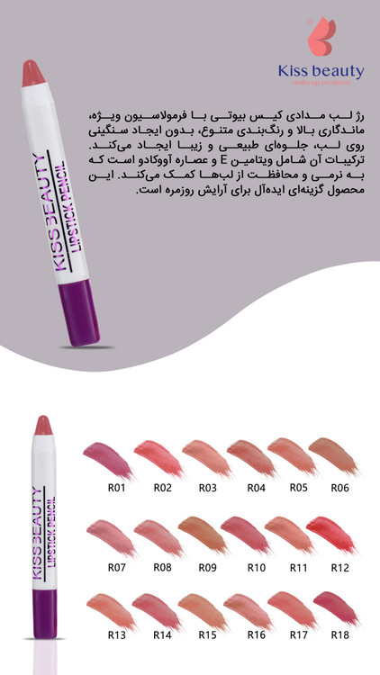 رژ لب مدادی کیس بیوتی با فرمولاسیون منحصر بفرد با ماندگاری طولانی و رنگهای جدید و متنوع.بعد از زدن این رژلب سریع خشک شده و رنگ آن ثابت میشود.فرمول این محصول دارای عصاره ویتامین E و آواکادو جهت نرمی و محافظت لب های شماست در تمامی طول روز لب های شما را زیبا میسازد بدون آنکه احساس سنگینی بر لبهای خود داشته باشید و به آن شادابی میبخشد همچنین به راحتی پاک میشود. رژ لب یکی از اصلی ترین مواد آرایش صورت می باشد که در واقع نقش روح بخشی به آرایش چهره را ایفا می کند و هرچه نمایی طبیعی و در عین حال زیبا و جذاب تری به لب ها بدهد باعت زیبا تر شدن چهره می شود.
