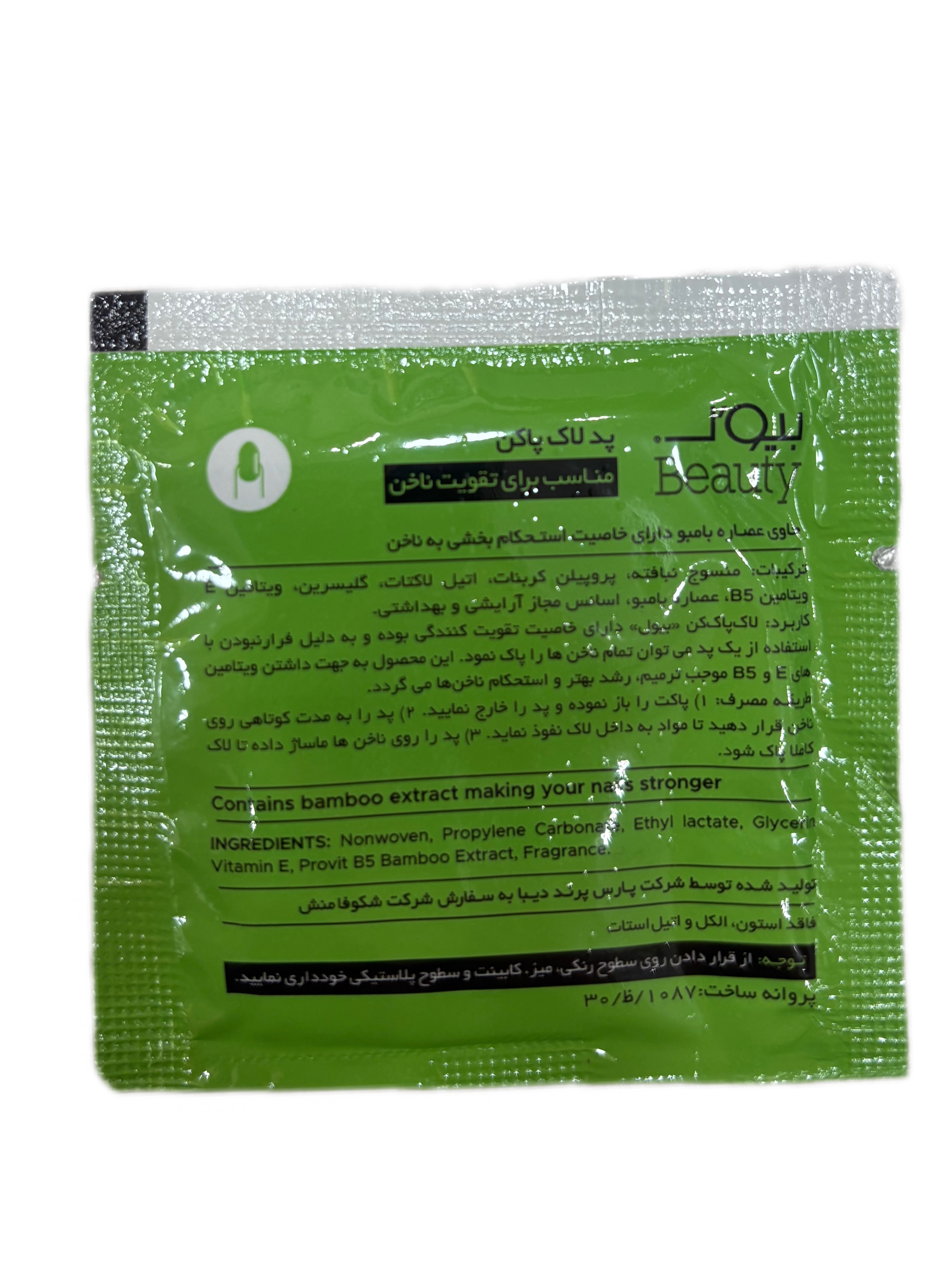 پد لاک پاک کن بیول حاوی ویتامین E و روغن کرچک، لاک و هر گونه پولیش را بدون احساس خشکی و سفیدک از روی ناخن هایتان پاک می کند. این پد استقامت ناخن را افزایش می دهد و ناخنهای شما را عاری از هر گونه باکتری کرده و انعطاف پذیری آن ها را دو چندان می کند. لاک پاک کن بیول فاقد استون و اتیل استات می باشد.